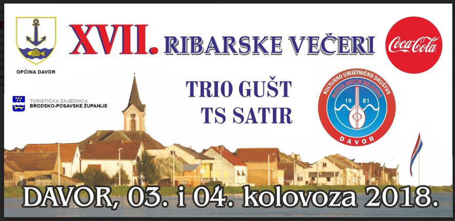KUD Matija Antun Relković i Općina Davor organiziraju i pozivaju vas na 17. kulturno gastronomsku manifestaciju “Ribarske večeri u Davoru”, u petak i subotu, 3. i 4. kolovoza u popodnevnim i večernjim satima. Uz obilje ribljih specijaliteta (šarani na rašljama, prženi šarani, fiš paprikaš, riblje salate…), za sjajnu atmosferu pobrinut će se domaći tamburaški sastavi, te tamburaši iz bliže okolice a nastupiti će i neke od zvijezda hrvatske estrade.