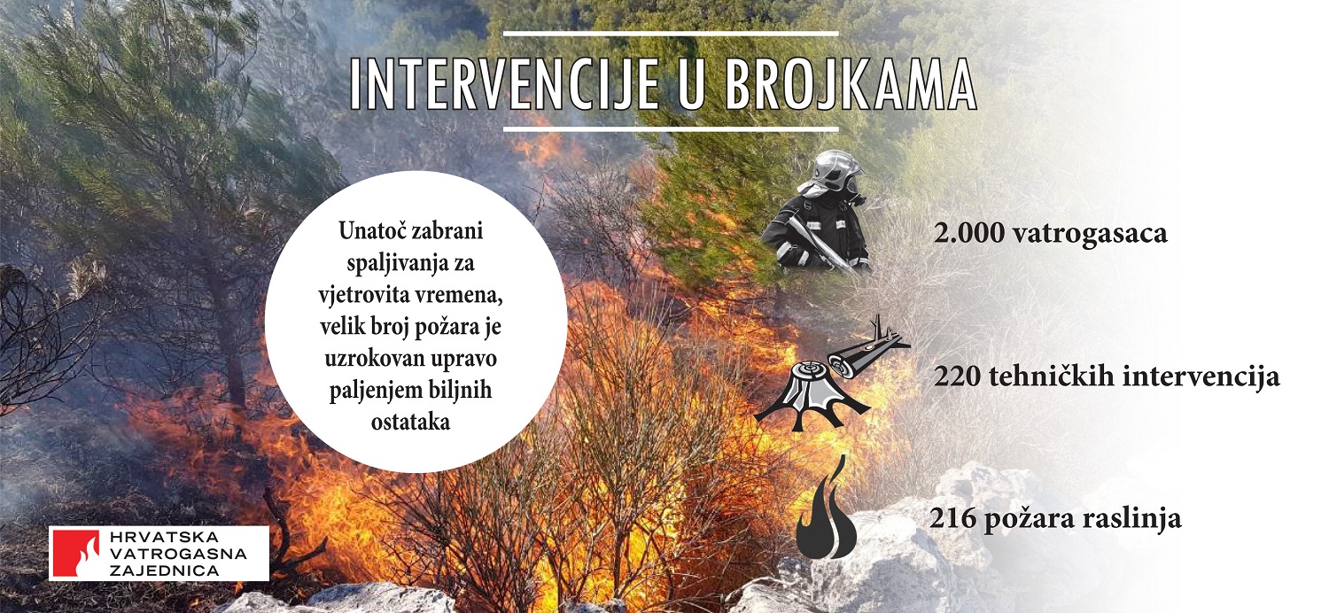 Vikend iza nas obilježio je ekstremno jak vjetar koji je diljem Hrvatske, a osobito na priobalju, prouzročio brojne probleme zbog čega su vatrogasci danonoćno bilježili intervencije. Prema podacima Vatrogasnog operativnog središta, od 22. do 25. veljače na intervencijama je sudjelovalo gotovo 2.000 vatrogasaca na 436 intervencija. Na području priobalja je zabilježena ukupna 201 tehnička intervencija u kojoj je sudjelovalo 626 vatrogasaca sa 229 vozila. Te su intervencije uključivale većinom uklanjanje srušenih stabala i granja, saniranje krovišta te skidanje fasade. U požarima raslinja na otvorenom prostoru zabilježeno je ukupno 149 požara, a opožarena površina iznosi 599 ha. U gašenju je sudjelovalo 917 vatrogasaca sa 316 vozila. Treba istaknuti kako je najveća opožarena površina, od 160 ha, zabilježena na požaru kod Tribunja koji je izbio u subotu, 23. veljače. “U požaru u kojem je snažna bura potpomagala njegovo širenje su sudjelovala 42 vatrogasca. Od jutros je požar lokaliziran te vjerujemo kako će do kraja dana biti proglašen ugašenim”, rekao je vatrogasni zapovjednik Šibensko-kninske županije Darko Dukić.