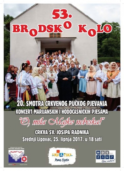 U sklopu programa 53. Brodskog kola u nedjelju 25. lipnja 2017. godine s početkom u 18.00 sati u crkvi  svetog Josipa Radnika (župa Gornji Lipovac) održati će se 20. smotra pučkog pjevanja. Biti će to ove godine koncert marijnskih i hodočasničkih pjesama pod nazivom „ O, mila Majko nebeska!“.