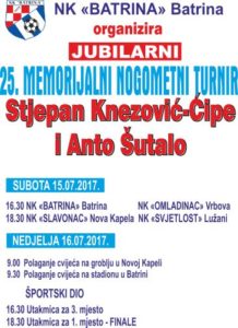 Prošlo je 26 godina od početka Domovinskog rata u kojem je Batrina izgubila svoja dva sina, dva viteza, a nogometni klub Batrina svoja dva igrača Stjepana Knezovića i Antu Šutala. Njima u spomen klub 25. puta za redom, u subotu 15. srpnja i u nedjelju 16. srpnja, organizira memorijalni nogometni turnir. Okupiti će se tih dana njihovi prijatelji, suborci, rodbina, mještani i kroz druženje, priču i nogometnu igru prisjećati se njihovih života i velikih i hrabrih djela.