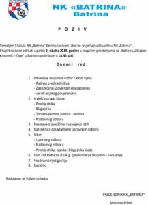NK „BATRINA“ – NAJAVA GODIŠNJE SKUPŠTINE