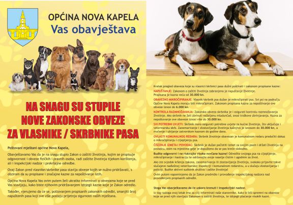OBAVEZNO MIKROČIPIRANJE: Vlasnik/skrbnik psa dužan je mikročipirati psa. Svi psi na području Općine Nova Kapela moraju biti mikročipirani. Zakonom propisana kazna za nepoštivanje ove obveze iznosi do 6.000 kn.