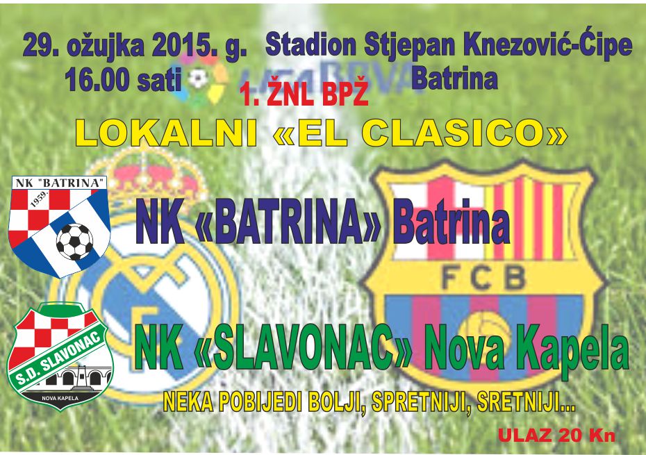 Kako smo obaviješteni od predsjednika NK „Batrina“ Miroslava Eržena, u nedjelju 29. ožujka sa početkom u 16.00 sati na stadionu „Stjepan Knezović-Ćipe, igra se u 16. kolu 1. ŽNL BPŽ lokalni „el clasico“. Sastaju se dva susjedna kluba, jedini predstavnici novogradiškog područja u 1.ŽNL, NK „Batrina“ i NK „Slavonac“ iz Nove Kapele.